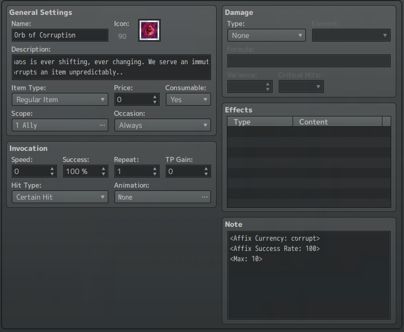 Preface; I'm hopelessly addicted to path of exile and have dreamed of having a system akin to their crafting system for RPG maker for a long time. This is the result of a lot of failure in implementation, and the experience learned from those failures. Now that everything is pretty much stable, I think we are ready for realease. You are free to modify this plugin, but do not claim it as your own, and please make sure to give Credit!